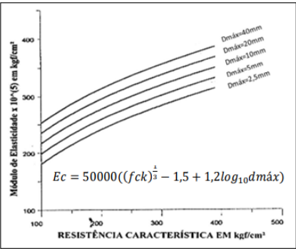 A partir da equação visualizada na figura ao lado (CARBONELL (1996)), apresentaram-se graficamente, uma série de curvas para diversos Módulos de Elasticidade (E), em função da dimensão máxima do agregado com valores de 2,5mm, 5mm, 10mm, 20mm e 40mm, conforme demonstra a figura.